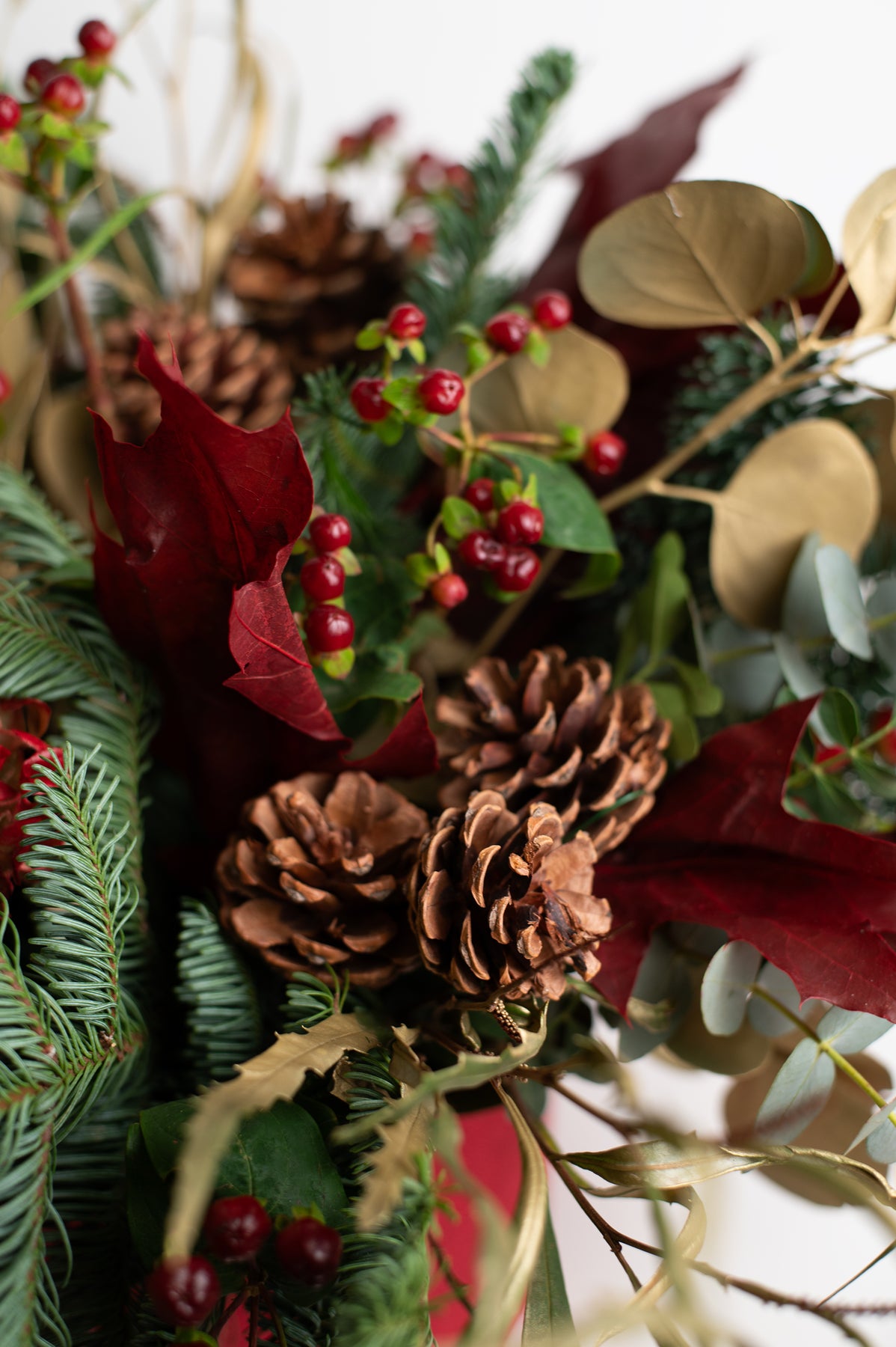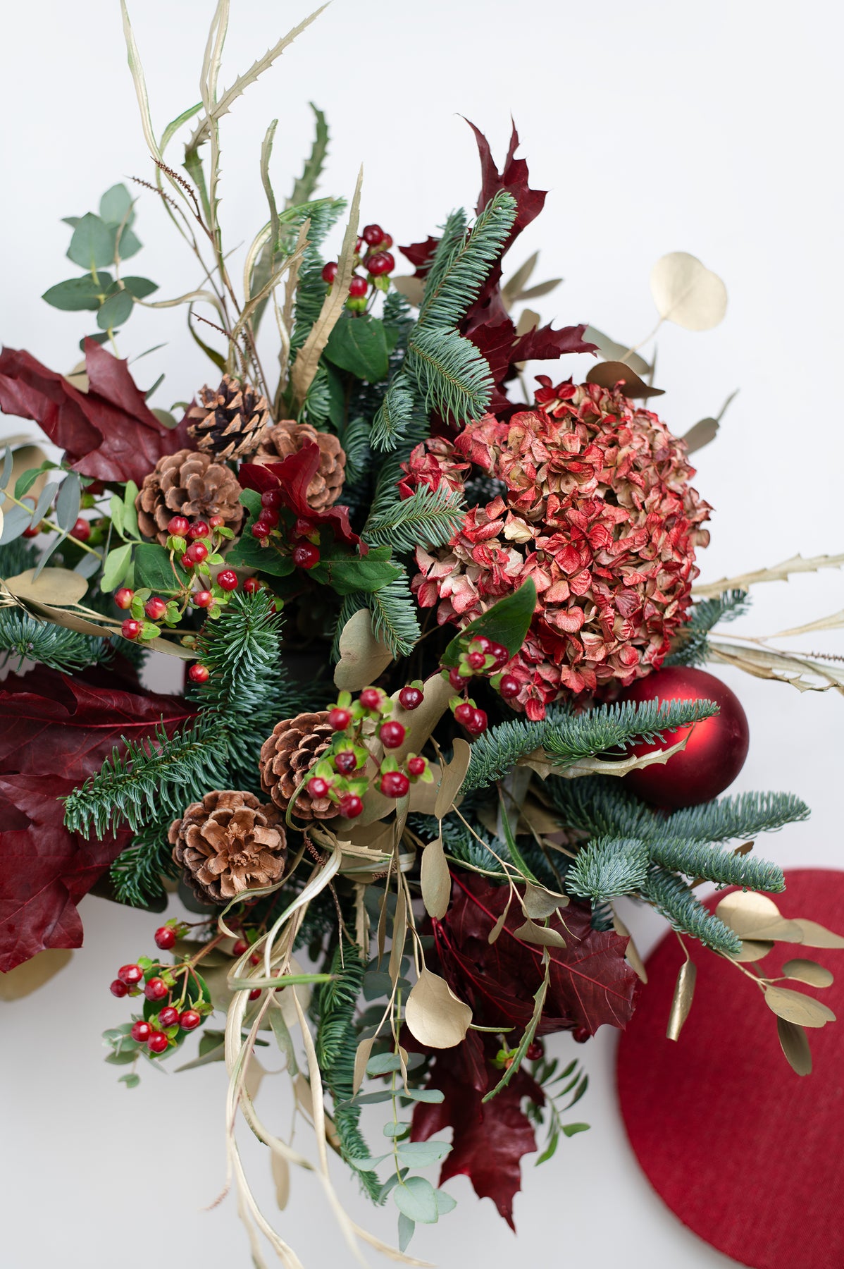 Herbsthortensie | grüne Sorte | Tanne | roter Ahorn | goldener Eukalyptus | rote Kugeln | 3 Stiele rotes Johanniskraut | 6 rote Tannenzapfen
