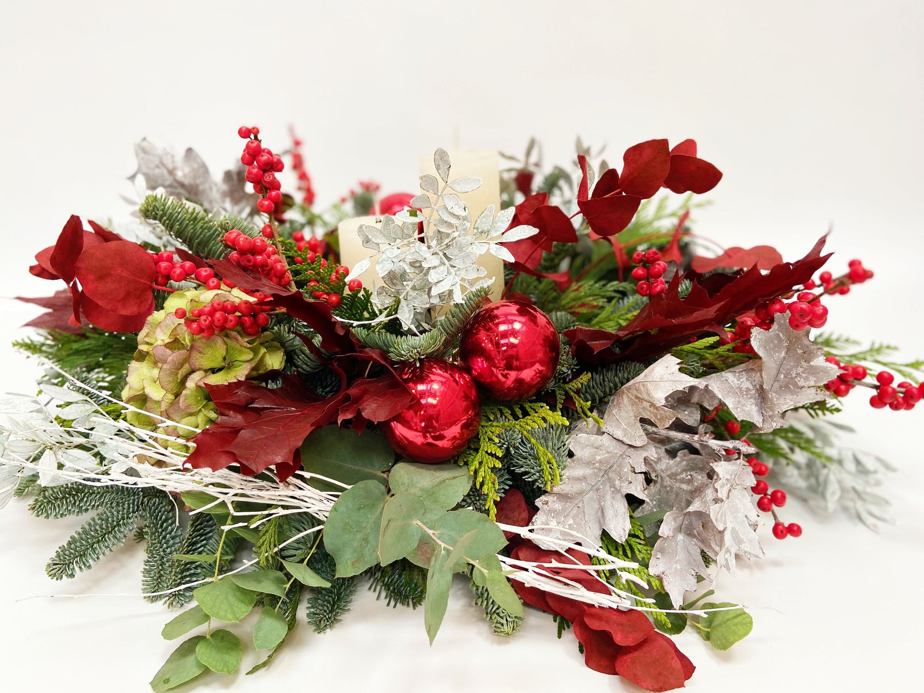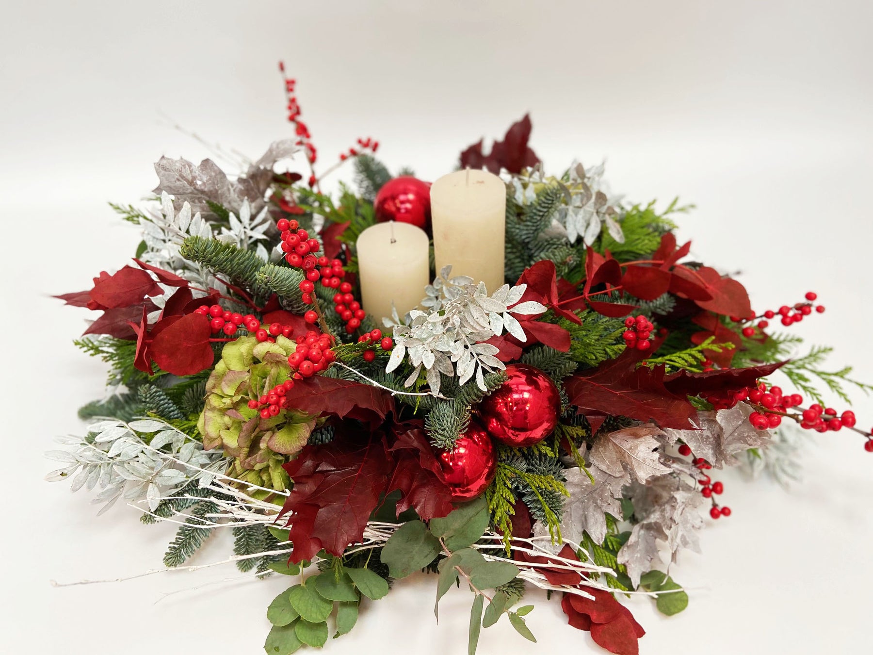 Perfekter weihnachtlicher Tafelaufsatz in Rot-, Grün- und Weißtönen, wunderbare Harmonie in der Komposition mit zwei Kerzen in unterschiedlichen Höhen.