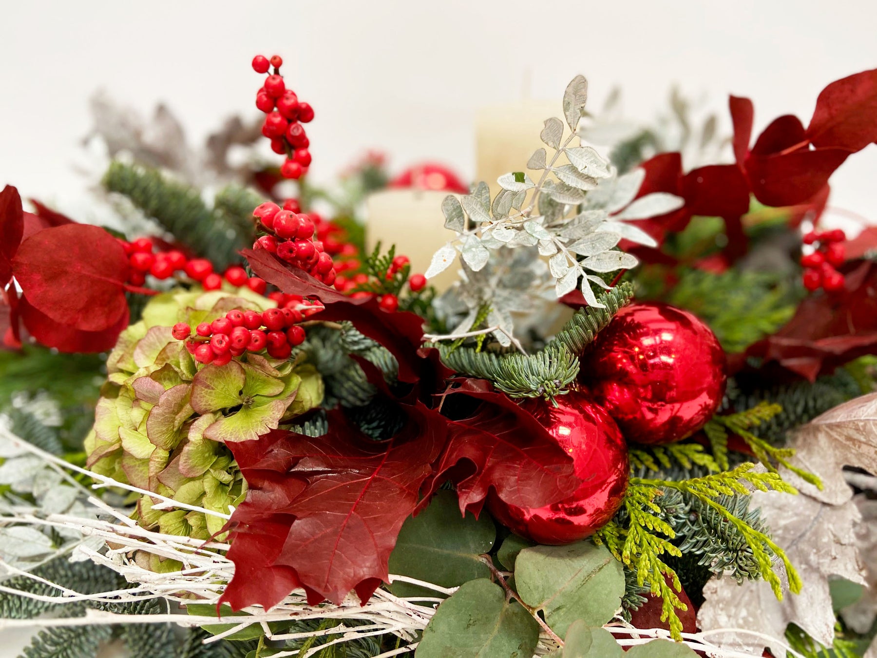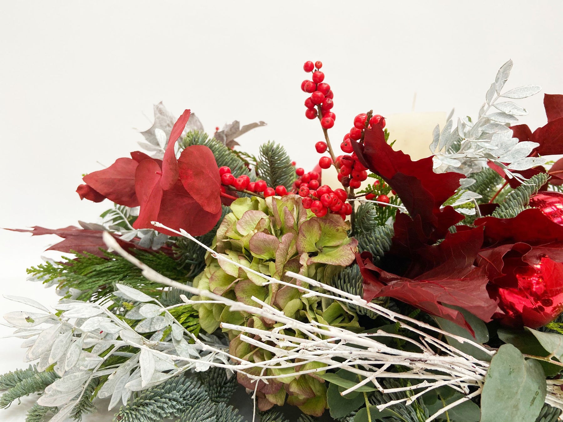 4 Zweige brich weiß | 5 Stiele Murta | 3 Stiele Weißer Ahorn | 3 Illex-Stangen | 1 Stab Granatahorn | 3 rote Eukalyptusstiele | 4 du gehst | 2 Weihnachtskugeln | 3 Thuja-Stängel | 2 Hortensien | 2 Kerzen unterschiedlicher Größe