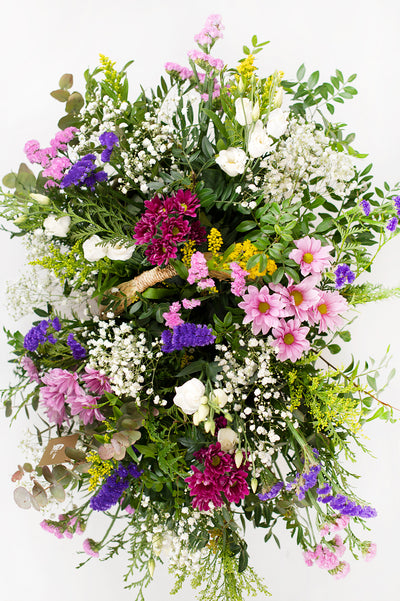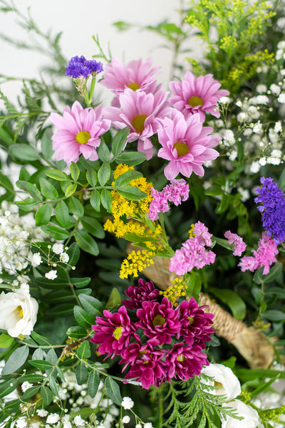 2 rosa Gänseblümchenstiele | 2 fuchsiafarbene Gänseblümchenstiele | 3 weiße Lisianthus-Stängel | 3 Stiele Lisianthus-Rosen | 4 Stängel Statice rosa und lila | 4 Solidago-Stiele | 6 Paniculata-Stängel | 5 Olivenstiele | 10 Stängel Murta | 4 Eukalyptusstiele |