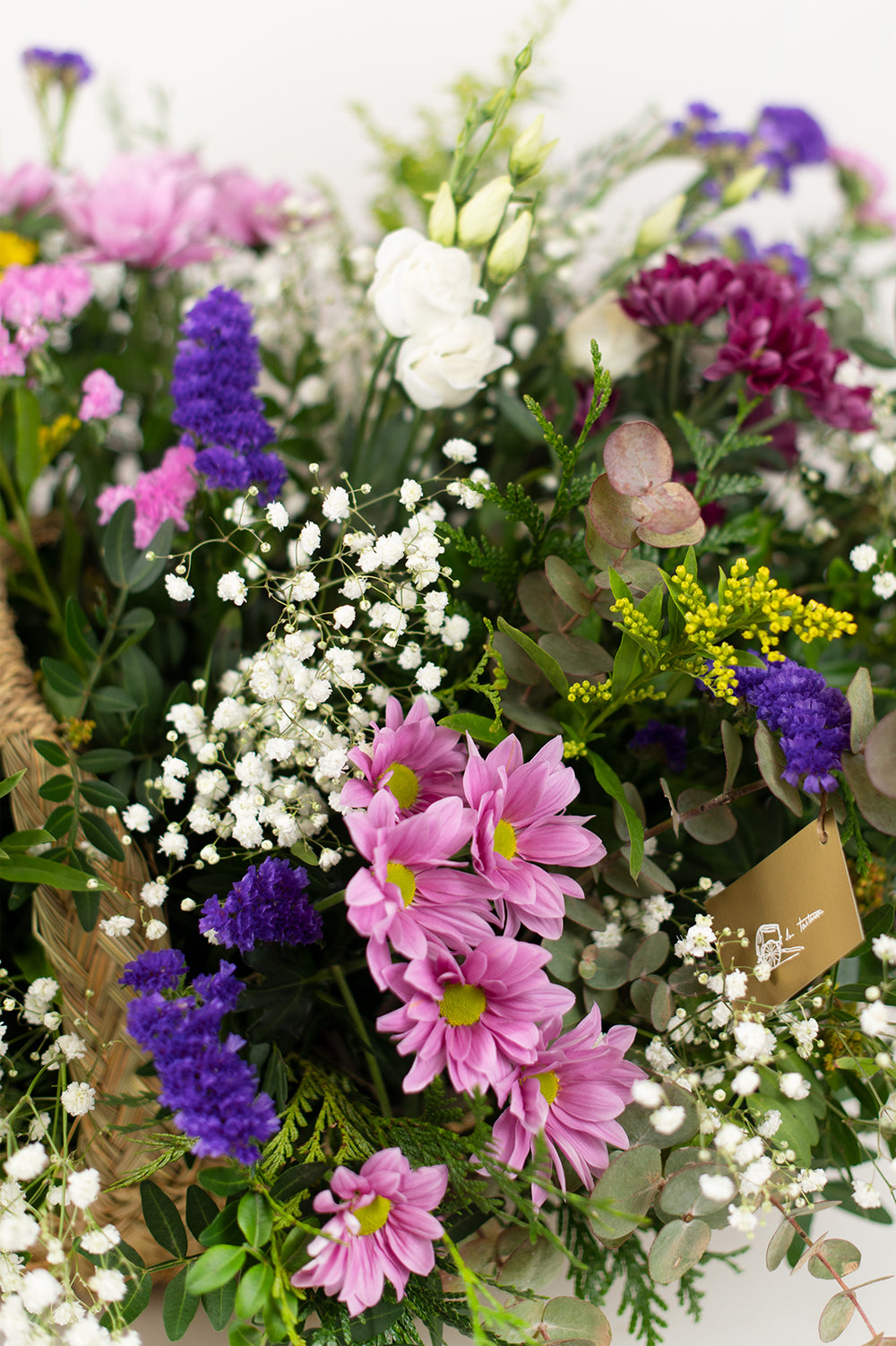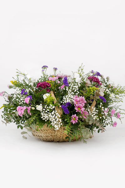 Eine exquisite und harmonische Blumenkomposition in Frühlingsfarben auf einem mittelgroßen Espartokorb.