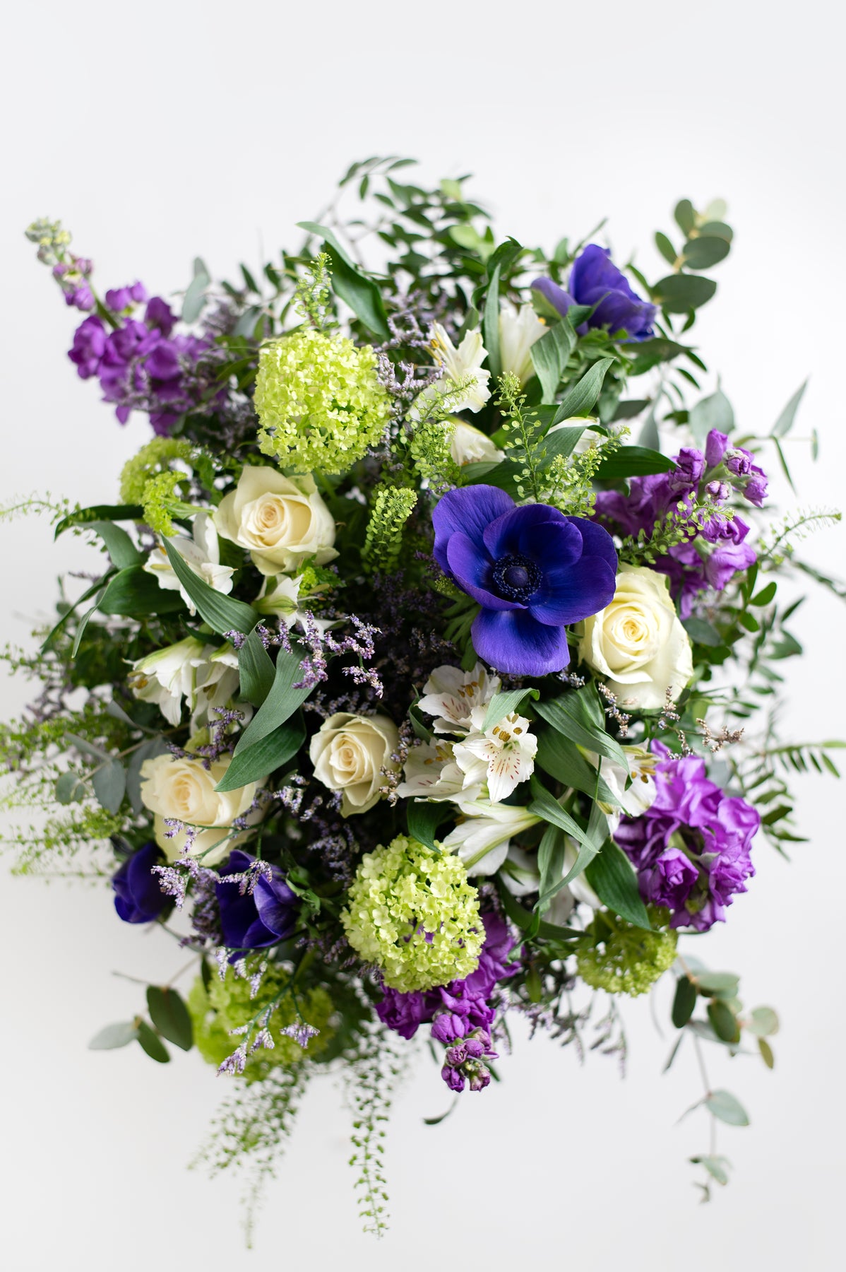 4 stems of purple antirrhinum, 4 white roses, 3 stems of white alstromelia, 4 purple anemones, viburnum, thalspi, eucalyptus, purple limonium and murta.