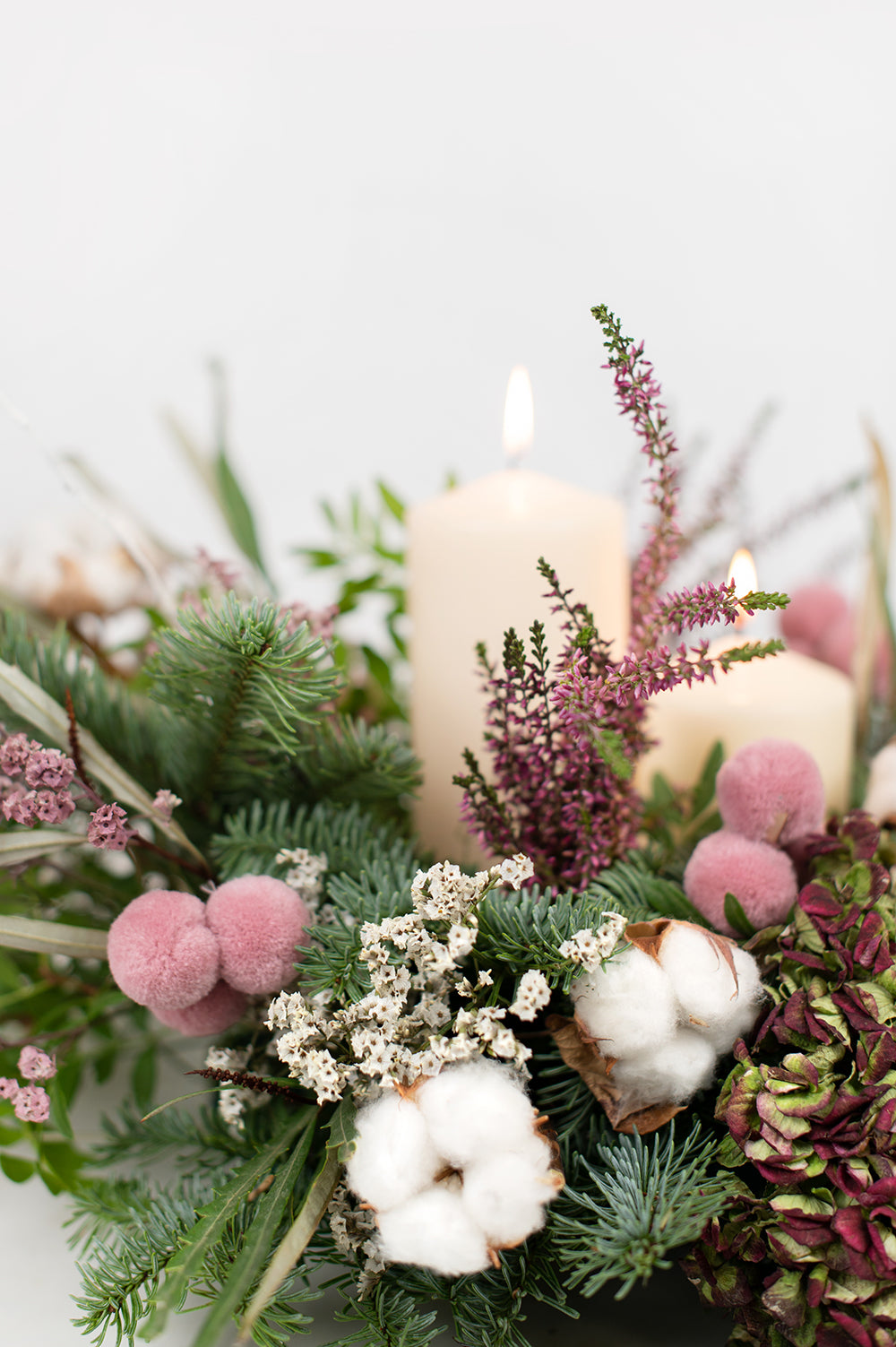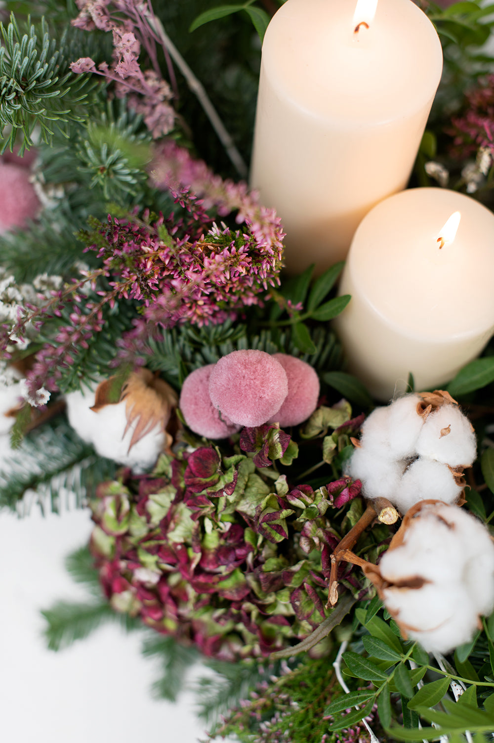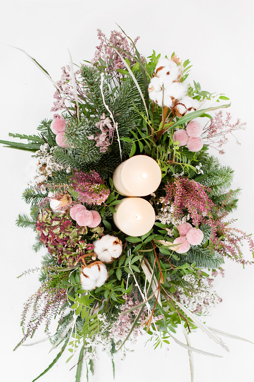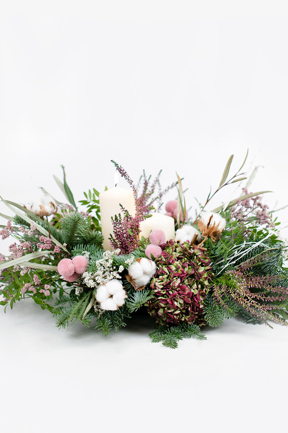 1 Cotton Rod | 10 heather | 3 Limonium pink | 3 Limonium white | 3 Set Set pink | 2 Rod of fir nobilis | 2 Murta | 2 Grevillea | 1 aged hydrangea | 1 small taco candle | 1 medium taco candle