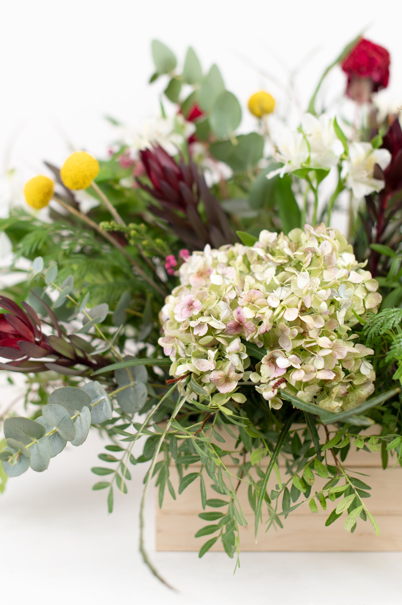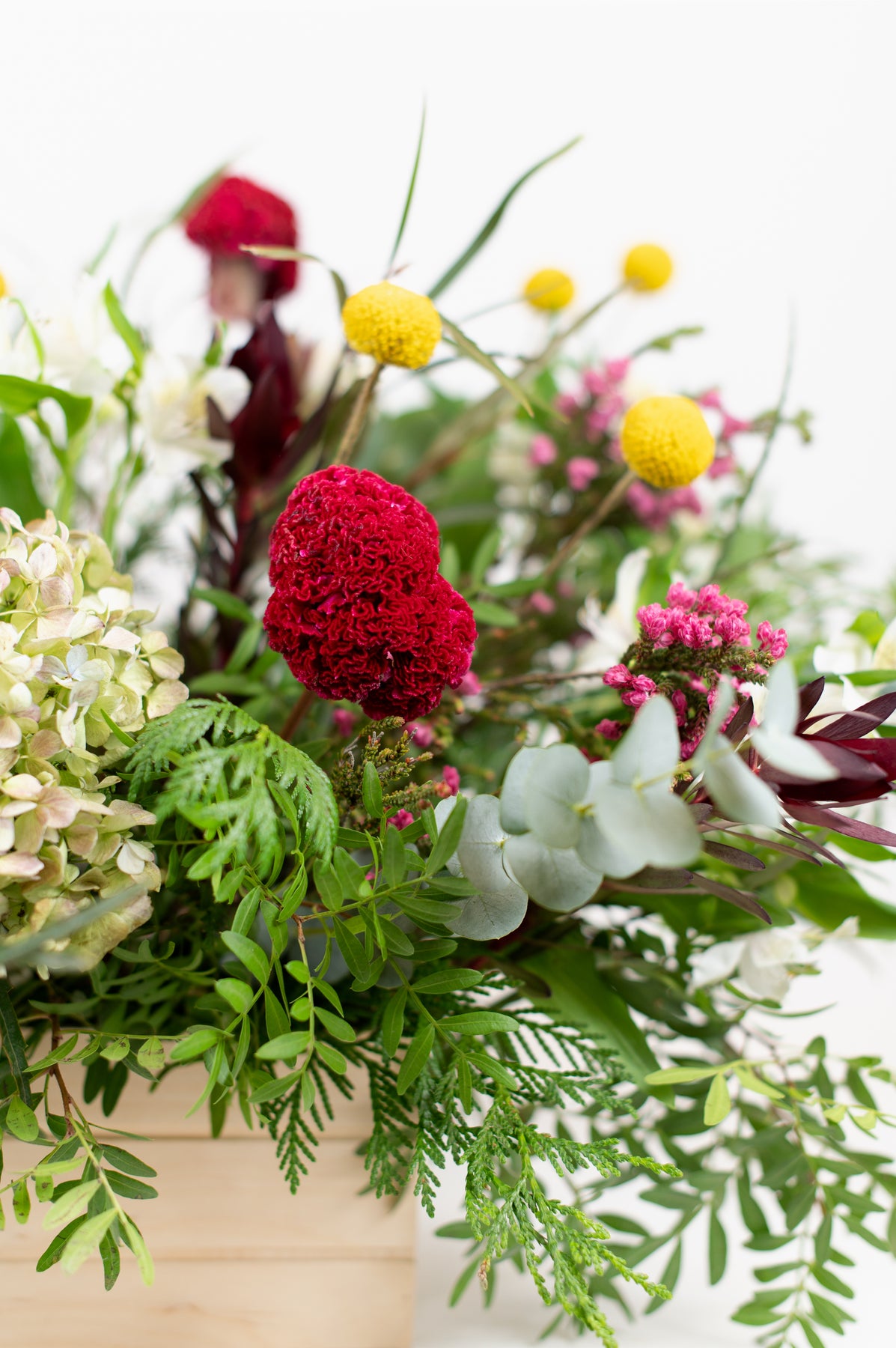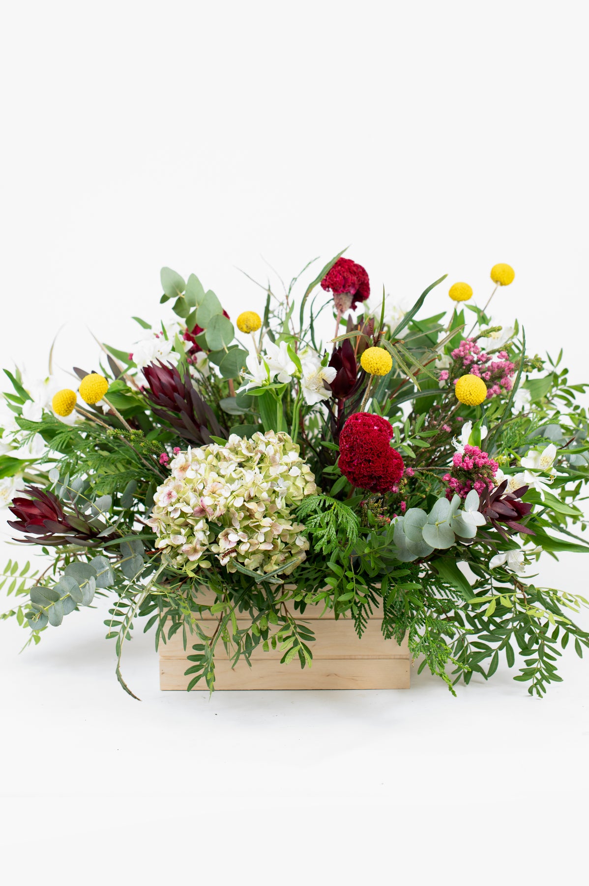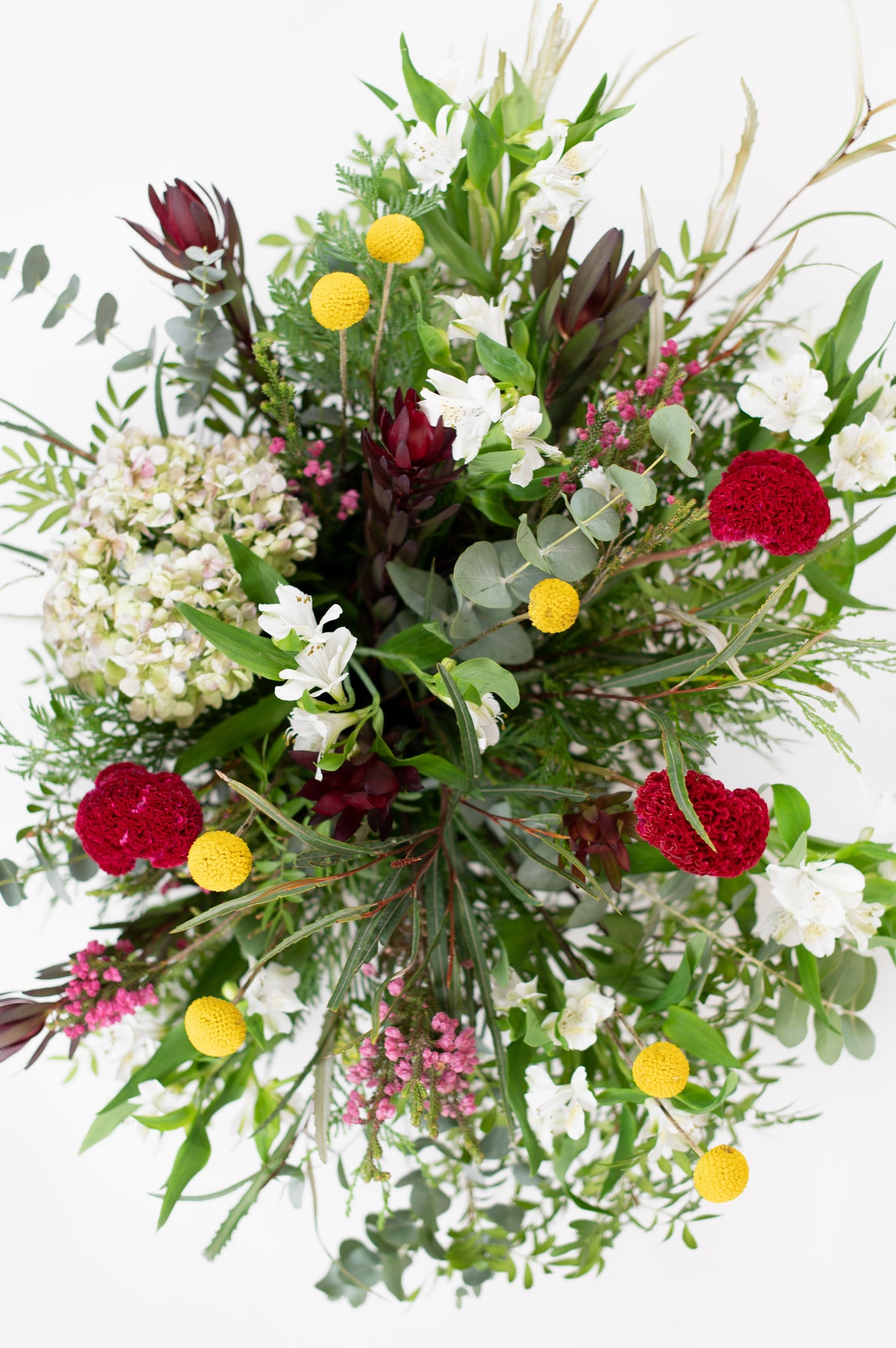 7 yellow craspedias | 1 hydrangea | 4 Stems Pink Wax Flower | 5 Stems Safari Sunset Maroon | 4 Stems of Red Celosia or Seasonal Red Flower | variety of greens