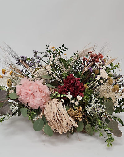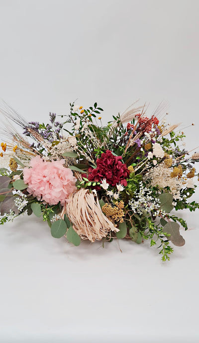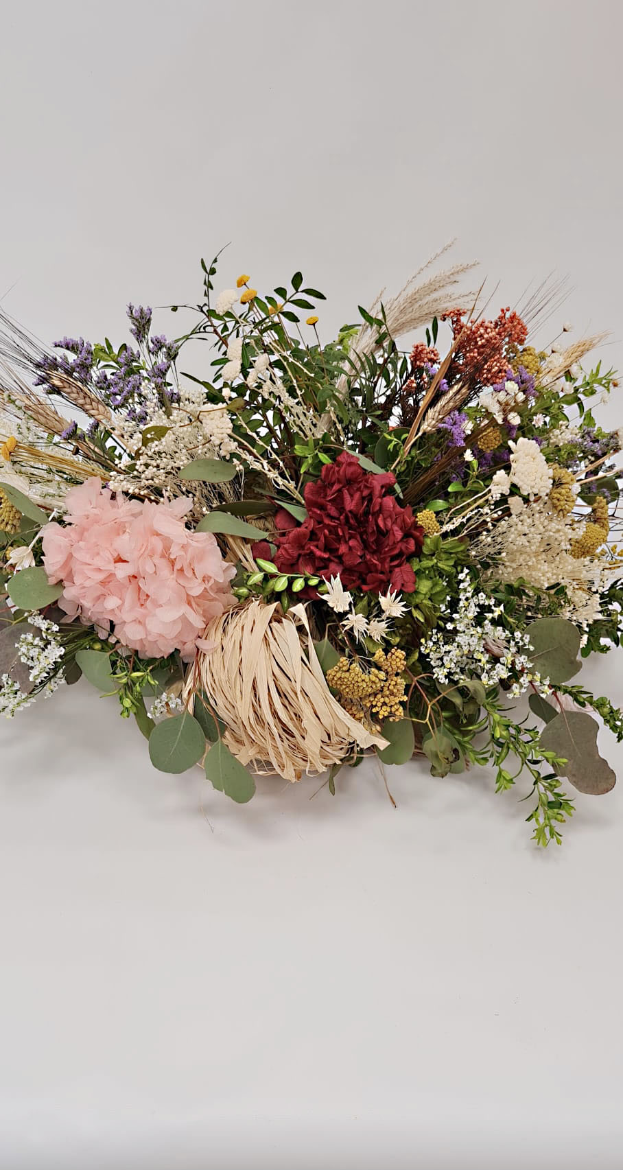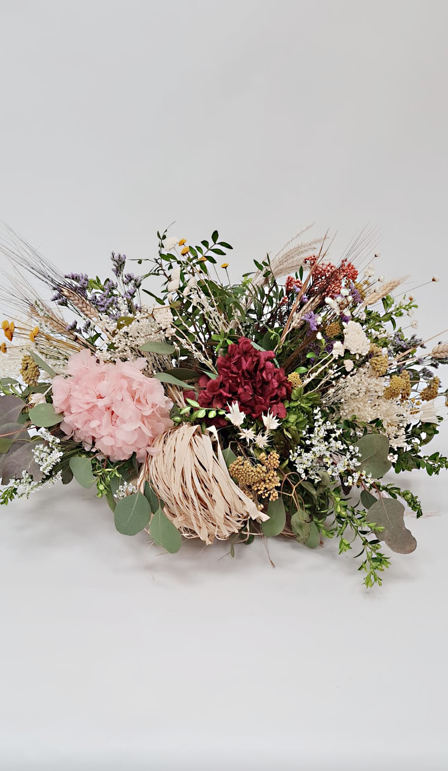 1 hortensia liofilizada rosa | 1 hortensia liofilizada granate | 5 tallos limonium morado | 3 tallos flor de arroz rosa | 10 tallos brooms crema | 10 tallos eucalipto | 7 espigas | 4 tallos achilea amarilla | 1 tallo filo blanco | 14 tallos botao amarillo | 10 tallos margaret blanca | 15 tallos marcela natural